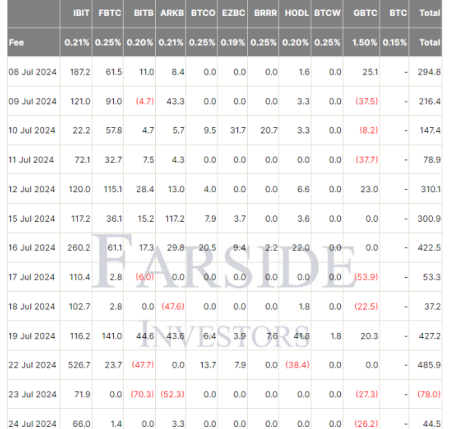 با این حال، جریان ورودی بیت کوین ETF در 24 جولای با افزایش 44.5 میلیون دلاری مواجه شد.