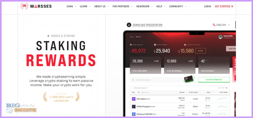 سایت سرمایه گذاری marsses یک سایت سرمایه گذاری ارز دیجیتال با بازده بالا میباشد. در این سایت میتوانید سود روزانه 0.54 درصد به بالا را دریافت نمایید. این سایت سرمایه گذاری سودهای بالا را به کاربران خود ارائه میدهد و شما میتوانید یکی از این پلن ها را فعال نمایید. در ادامه آموزش های لازم در سایت بیگ اینکام به شما داده میشود.