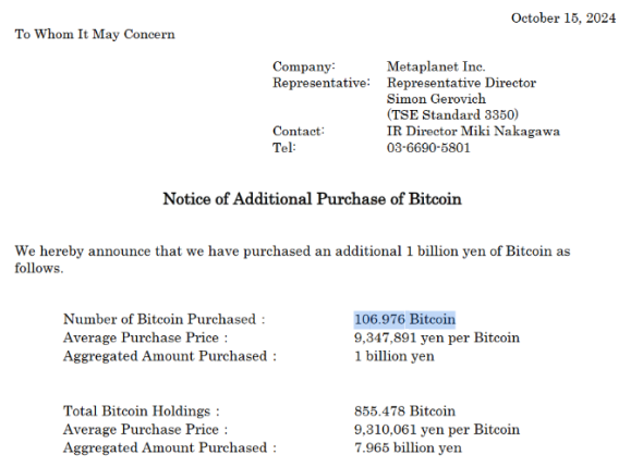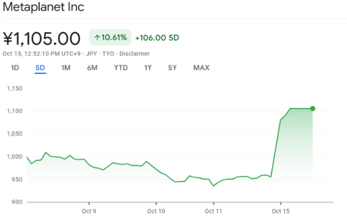 پس از اینکه شرکت سرمایه گذاری ژاپنی آخرین خرید تقریباً 107 بیت کوین خود را اعلام کرد، در 15 اکتبر، سهام متاپلنت 15.7 درصد افزایش یافت.