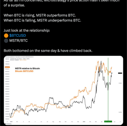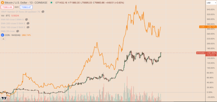 این احساس در سهام کوین بیس (COIN) قابل مشاهده است که در دوازده ماه گذشته بهتر از بیت کوین عمل کرده است . اما در درجه اول به دلیل شکایتی که توسط کمیسیون بورس و اوراق بهادار ایالات متحده (SEC) علیه آن تنظیم شده است، از مایکرواستراتژی ضعیف عمل می کند.