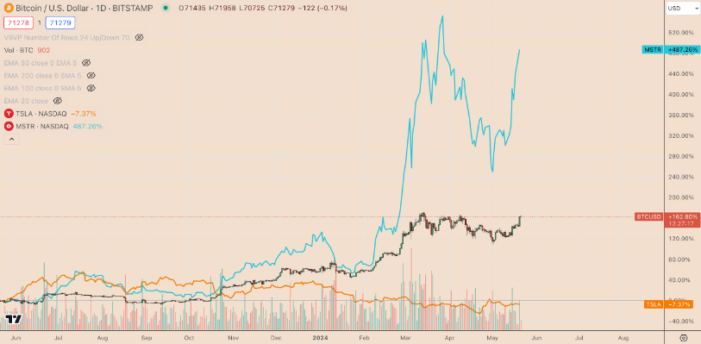 سهام MSTR بیش از 500 درصد در یک سال و 150 درصد از سال تا به امروز (YTD) افزایش یافته و تا 21 می به حدود 1279 دلار در هر سهم رسیده است. در مقایسه، قیمت بیت کوین در یک سال 166 درصد و حدود 60 درصد افزایش یافته است.