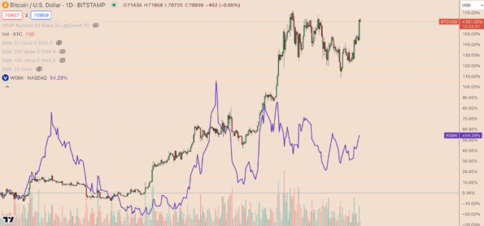 علاوه بر این، سهام ماینینگ عملکرد ضعیف بیت کوین و میکرواستراتژی را نیز آغاز کرده اند ، که بازده ETF ماینرهای بیت کوین والکری (WGMI) – که شرکت های استخراج بیت کوین با ارزش بالا را دنبال می کند – در 12 ماه گذشته نشان داده شده است.
