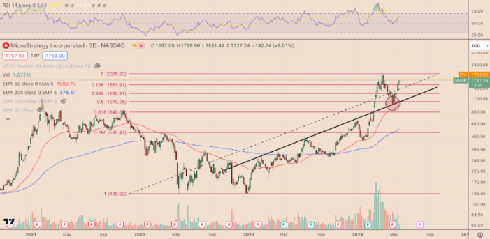 از منظر فنی، به نظر می رسد MSTR پس از آزمایش یک تلاقی پشتیبانی شامل سطح اصلاحی فیبوناچی 0.5، میانگین متحرک نمایی 50 روزه (EMA 50 روزه؛ موج قرمز) و مقاومت تبدیل شده به حمایت، در حال بازگشت به 2000 دلار بوده است.