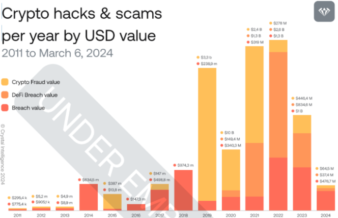 هکها و اکسپلویتهای کریپتو یکی از بزرگترین موانعی هستند که مانع اعتماد و پذیرش جریان اصلی میشوند. هک های کریپتو در سال 2024 به طور بالقوه می تواند سال 2023 را پشت سر بگذارد، زیرا در سه ماهه اول سال 2024 دارایی های به سرقت رفته به ارزش 542.7 میلیون دلار بود که در مقایسه با مدت مشابه در سال 2023 افزایش 42 درصدی را نشان می دهد.