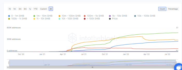 داده های آدرس ntoTheBlock توسط هولدینگ ها برای درک چگونگی عملکرد دارندگان بزرگتر یا کوچکتر هر ارز دیجیتال در طول زمان با افزایش یا کاهش موجودی خود استفاده می شود. با استفاده از این، آدرسهایی که بین 100 میلیارد تا 1 تریلیون توکن شیبا اینو دارند، موجودی خود را 3.48 درصد افزایش دادهاند. در همین حال، آدرسهایی که دارای 0 تا 1 میلیون SHIb و آنهایی که دارای 100 میلیون تا 1 میلیارد SHIB هستند، در 30 روز گذشته افزایش 2.20 درصدی و 2.37 درصدی را نشان دادهاند.