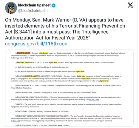 یکی از کاربران X درج استراتژی آشکار سناتور مارک وارنر از عناصر قانونگذاری را در 5 ژوئن پست کرد، که امکان بررسی دقیق اختیارات فراگیر جدید اعطا شده به رئیس جمهور ایالات متحده در مورد دارایی های دیجیتال را فراهم می کند.