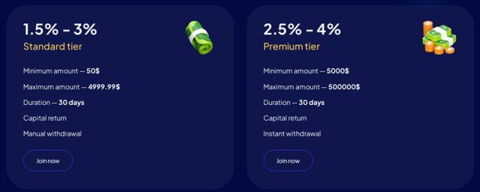 از 50 دلار تا 4999 دلار با سود روزانه 1.5 تا 3 درصد به مدت 30 روز. (سود روزانه بصورت تصادفی هر روز یک میزان از 1.5 تا 3 درصد تعیین میشود)