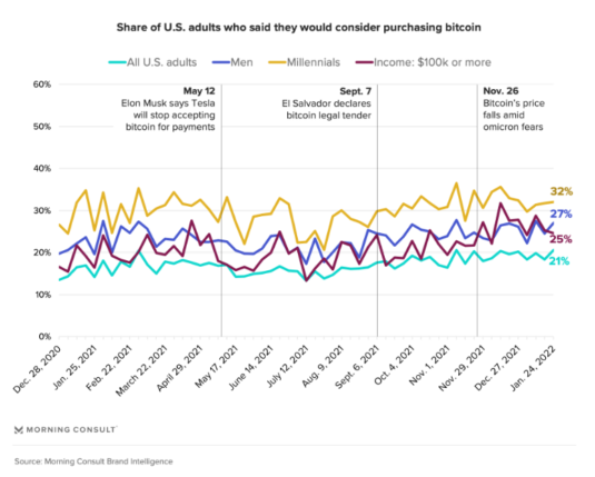 طبق یک نظرسنجی اخیر که توسط شرکت اطلاعات Morning Consult منتشر شده است، بیش از یک پنجم بزرگسالان آمریکایی از هفته گذشته به فکر خرید بیت کوین ، بزرگترین ارز دیجیتال بودند.