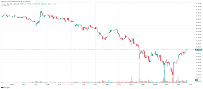 بیت کوین از آن زمان تا ساعت 9:40 صبح UTC به بالای 57800 معامله شد، اما همچنان در نمودار روزانه بیش از 4.5 درصد کاهش داشت.