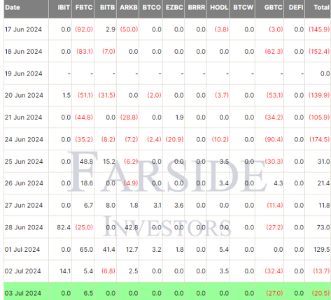 با وجود سقوط، خریداران ETF شروع به فروش وحشتناک نکردهاند، زیرا در 3 ژوئیه تنها 20.5 میلیون جریان خالص کل خروجی وجود داشت. طبق دادههای فارسید اینوستور، ETF گری اسکیل بیشترین یا به ارزش 27 میلیون دلار خروجی را به خود اختصاص داد.