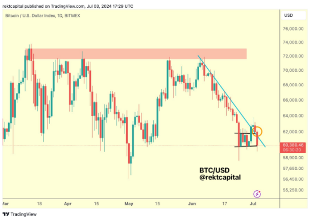 به گفته تحلیلگر محبوب رمزارز Rekt Capital که در پستی در 3 ژوئیه X نوشت ، این بدان معنی است که شکست احتمالی بیشتر به تعویق خواهد افتاد، تا زمانی که BTC روند نزولی را که در اوایل ژوئن آغاز شده بود بشکند: