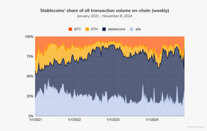 گزارش Chainalysis بر تسلط استیبل کوین ها در تراکنش های زنجیره ای تاکید کرد. بر اساس این گزارش، استیبل کوین ها بین 50 تا 75 درصد از کل تراکنش های زنجیره ای را از آغاز سال 2024 به خود اختصاص داده اند.