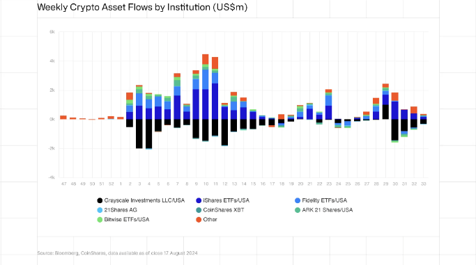 علیرغم خروج 528 میلیون دلاری از محصولات سرمایه گذاری دارایی دیجیتال در هفته 3 آگوست، علاقه نهادی به سرمایه گذاری دارایی دیجیتال همچنان بالاست ، همانطور که با ورود قوی به صندوق سرمایه گذاری بیت کوین آی شرز بلک راک و صندوق بیت کوین Wise Origin Fidelity به مبلغ 20.3 میلیون دلار و 61.3 میلیون دلار مشهود است.