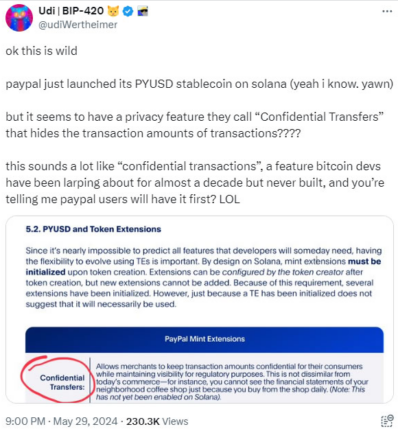 اودی ورتایمر، بیتکوینکننده میگوید: «این بسیار شبیه «تراکنشهای محرمانه» به نظر میرسد، ویژگیای که توسعهدهندگان بیتکوین تقریباً یک دهه در مورد آن صحبت میکنند اما هرگز ساخته نشدهاند، و شما به من میگویید که کاربران پی پال ابتدا آن را خواهند داشت؟