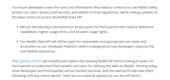 در ماه آوریل، Reddit اعلام کرد که قصد دارد نحوه تعامل کاربران با Reddit Data API را تغییر دهد، برنامهای هفت ساله که توسعهدهندگان را قادر میسازد ابزار و ابزارهایی را برای تعدیل و سایر فعالیتها ایجاد کنند.