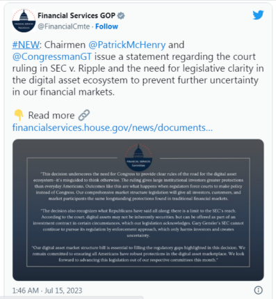 اگرچه نبرد حقوقی ریپل با SEC برای اولین بار در دسامبر 2020 به پایان نرسیده است، حکم XRP در حال حاضر موج های قابل توجهی را در فضای رمزنگاری ایجاد کرده است. بسیاری از صرافیهای ایالات متحده اعلام کردهاند که تجارت برای توکن را دوباره فعال کردهاند یا انجام این کار را برای اولین بار در بیش از دو سال گذشته بررسی میکنند، و برخی از قانونگذاران مجدداً خواستار شفافسازی نظارتی شدهاند.