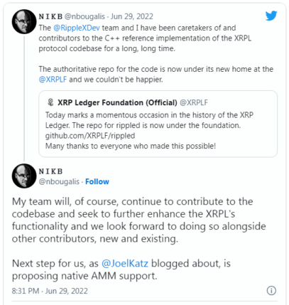 مدیر مهندسی ریپل، “NIKB” در این باره اظهار داشت که ریپل به کمک به پایگاه کد ادامه خواهد داد و در عین حال معرفی عملکرد AMM بومی را به عنوان مرحله بعدی توسعه XRPL پیشنهاد می کند.