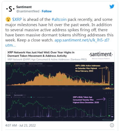 همانطور که توسط Santiment نشان داده شده و توسط بیگ اینکام گزارش شده است، رپل در هفته گذشته به نقاط عطف مهمی دست یافته است.
