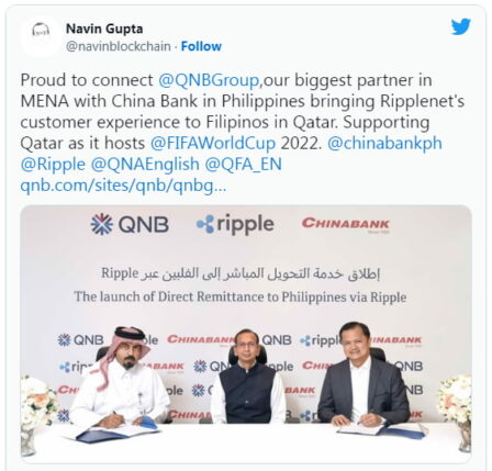 در اقدامی تاریخی، شریک ریپل، QNB ، یک سرویس حواله مستقیم برای انتقال پول از قطر به فیلیپین راه اندازی کرده است. این اولین بانک در قطر است که این سرویس را معرفی می کند.