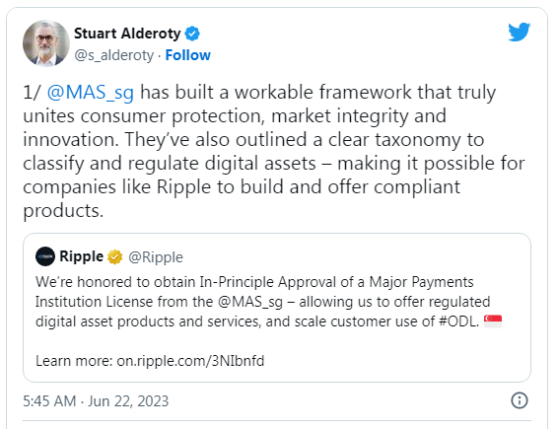 براد گارلینگ هاوس، مدیرعامل ریپل، رگولاتور سنگاپور را به دلیل «رویکرد عملگرایانه و نوآورانه اول» در خدمات مرتبط با ارزهای دیجیتال ستایش کرد و افزود که این کشور «دروازهای برجسته» برای عملیات تجاری ریپل در منطقه آسیا و اقیانوسیه فراهم خواهد کرد .