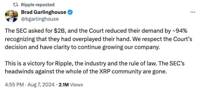 این یک پیروزی برای ریپل، صنعت و حاکمیت قانون است. مدیر عامل شرکت نوشت: باد مخالف SEC علیه کل جامعه XRP از بین رفته است.