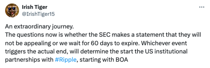 اگر SEC تا 6 اکتبر درخواست تجدیدنظر بدهد، احتمالاً به تصمیم دادگاه ژوئیه 2023 تورس مربوط می شود ، که حکم داد XRP یک اوراق بهادار نیست بلکه فقط زمانی که به سرمایه گذاران خرد فروخته می شود . در همان زمان، تورس حکم داد که XRP زمانی که به سرمایه گذاران نهادی فروخته می شود، همچنان یک اوراق بهادار است. ترت در پایان ارتباط خود با SEC و ریپل اظهار داشت :