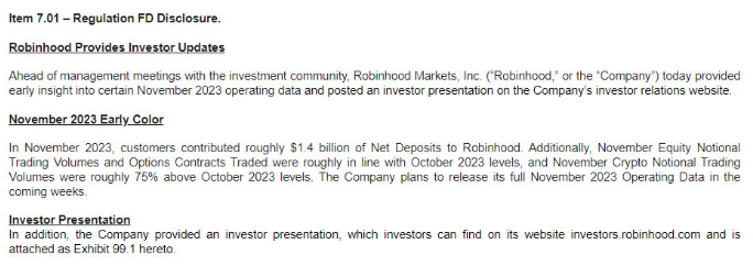 در یک فرم 8-K که در 4 دسامبر به کمیسیون بورس و اوراق بهادار ایالات متحده (SEC) ارسال شد ، رابینهود خاطرنشان کرد که “حجم معاملات واقعی رمزارز در نوامبر تقریباً 75٪ بالاتر از سطح اکتبر 2023 بود.”