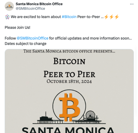این شهر در حال تبلیغ جشنواره بیت کوین Peer to Pier است که به نظر می رسد مربوط به رویدادی باشد که قرار بود توسط سوان بیت کوین حمایت شود. در 5 آگوست، سوان اعلام کرد که جشنواره بیت کوین اقیانوس آرام خود را که در سانتا مونیکا برگزار می شود، به دلیل کاهش کارکنان لغو می کند.