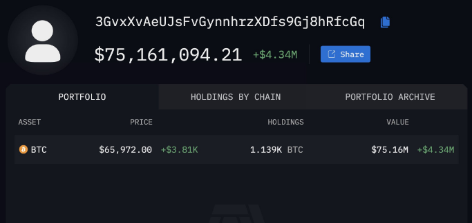 وی افزود که علیرغم حرکت های اخیر، کیف پول نهنگ هنوز ۷۵.۲ میلیون دلار بیت کوین دارد.