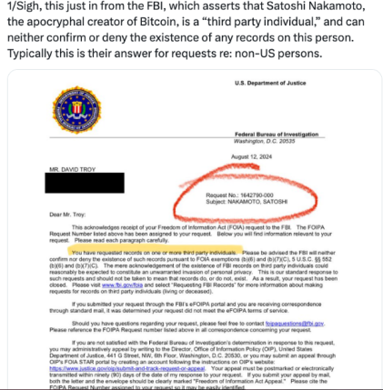 بر اساس پست 13 آگوست X توسط روزنامهنگار تحقیقی دیو تروی، FBI به درخواست او برای اطلاعات درباره ساتوشی “پاسخ گلومار” صادر کرد – نه تایید و نه رد کرد که آژانس مجری قانون سوابقی مبنی بر شناسایی خالق بیت کوین مستعار دارد. تروی گفت که قصد دارد نسبت به پاسخ FOIA درخواست تجدید نظر کند، اما مدعی شد که FBI با بیان اینکه ساتوشی یک “فرد ثالث” است “ادعای جالبی” ارائه کرده است.