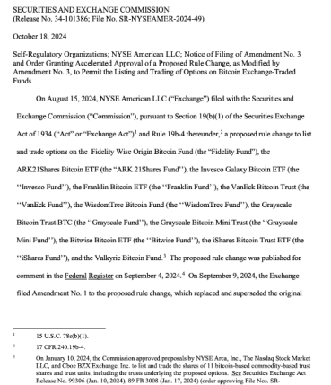 در تاریخ ۱۸ اکتبر ۲۰۲۴، کمیسیون بورس و اوراق بهادار ایالات متحده (SEC) با درخواست های بورس نیویورک (NYSE) و بورس اختیار معامله شیکاگو (CBOE) برای فهرست شدن اوراق اختیار خرید و فروش مرتبط با صندوق های قابل معامله در بورس (ETF) بیت کوین موافقت کرد. این اقدام پس از ماه ها بررسی و ارزیابی درخواست ها انجام شد و امیدواری زیادی برای جذب نقدینگی بیشتر به بازارهای ارز دیجیتال ایجاد کرده است.