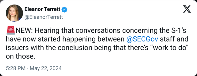 روزنامهنگار النور ترت گزارش داد که بحثها بین کارکنان SEC و صادرکنندگان ETF اسپات اتریوم در مورد فرمهای S-1 با این درک به پایان رسید که هنوز «کار برای انجام دادن» وجود دارد.