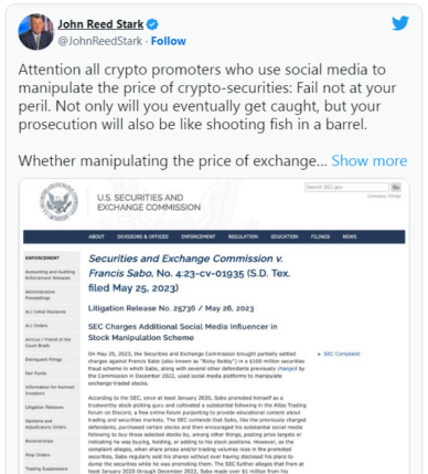 استارک به مثالی از اینفلوئنسر معروف کریپتو فرانسیس سابو اشاره کرد که در یک پرونده کلاهبرداری 100 میلیون دلاری در اوراق بهادار متهم شد و از پلتفرم های رسانه های اجتماعی برای دستکاری سهام معامله شده در بورس استفاده کرد.