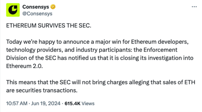 Consensys توسعه دهنده اتریوم در پستی در 19 ژوئن X گفت : بخش اجرای SEC به ما اطلاع داده است که تحقیقات خود را در مورد اتریوم 2.0 بسته است.
