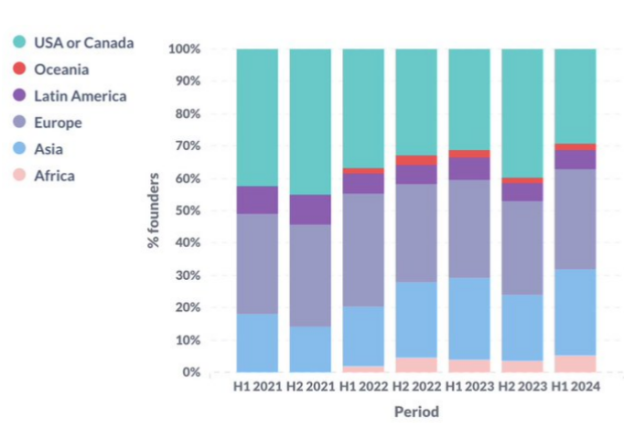 در نیمه اول سال 2024، سهم استارتآپهای ارزهای دیجیتال راهاندازی شده در آفریقا و آسیا به بالاترین سطح خود رسید و در میان عدم قطعیت نظارتی اخیر، سهم ایالات متحده و کانادا را ربود.