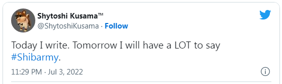شیتوشی کوساما ، توسعهدهنده اصلی شیبا اینو، ممکن است چیزی برای گفتن به جامعه SHIB داشته باشد زیرا او در توییتی نوشت: “امروز مینویسم. فردا چیزهای زیادی برای گفتن به #ارتش شیبا خواهم داشت.”