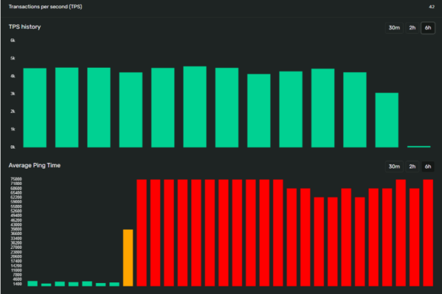 امروز، در 25 فوریه 2023، بلاک چین سولانا با «مشکلات شبکه» مواجه شد: اعتبار تراکنشهای کاربر را در حدود ساعت 6 صبح UTC متوقف کرد. کاوشگران بلوک عمومی 99 درصد تخریب شبکه را ثبت کردند: پهنای باند تراکنش سولانا از 4300 به 42 تراکنش در ثانیه (TPS) کاهش یافت.