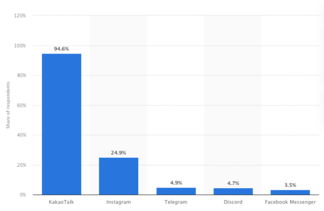 برنامه پیام رسانی محلی KakaoTalk به طور قابل توجهی جذب کاربر بیشتری را به خود جلب کرده است و حداقل 95٪ از پاسخ دهندگان استفاده از آن را نشان می دهند. اینستاگرام در رتبه دوم قرار گرفت و 25 درصد از پاسخ دهندگان نشان دادند که در کره جنوبی از آن استفاده می شود.
