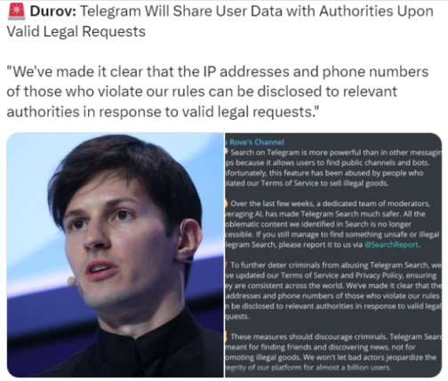 پاول دوروف، مدیر عامل تلگرام در 23 سپتامبر اعلام کرد که اپلیکیشن پیام رسان آدرس های IP و شماره تلفن کاربرانی را که قوانین برنامه را نقض می کنند به اشتراک می گذارد.