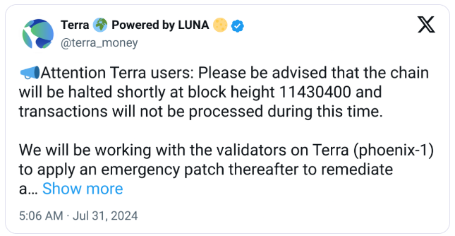 بلاک چین ترا اعلام کرده است که این زنجیره به طور موقت در ارتفاع بلوک 11430400 متوقف میشود و تراکنش های کاربر دیگر در طول زمان خرابی پردازش نمی شود.