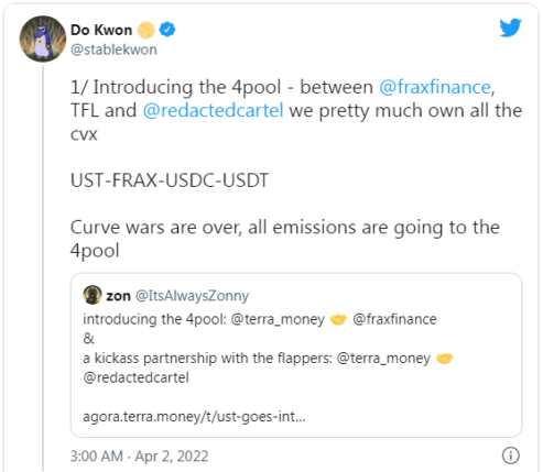 آقای کوان امروز، 2 آوریل 2022، اعلام کرد که تیم او قصد دارد یک استخر نقدینگی جدید را همراه با شرکتهای اصلی DeFi Frax Finance و Redacted Cartel راهاندازی کند.