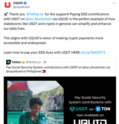 تتر با شرکت خرید و زیرساخت وب3 Uquid همکاری کرده است تا به شهروندان فیلیپین اجازه دهد تا سهم SSS خود را در Tether در بلاک چین شبکه باز پرداخت کنند. Uquid گفت که همکاری با تتر نشان میدهد که چگونه استیبلکوینهایی مانند USDT و «کریپتو به طور کلی میتوانند زندگی روزمره ما را سادهتر و بهبود بخشند».
