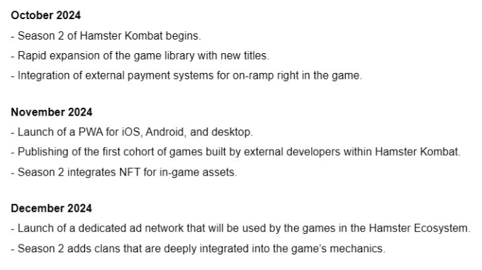 برای سه ماهه چهارم 2024، این بازی شامل یکپارچه سازی سیستم های پرداخت خارجی، راه اندازی بازی های جدید در اکوسیستم همستر و ادغام توکن های غیر قابل تعویض به عنوان دارایی های درون بازی است.