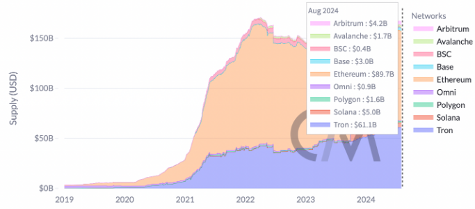 ترون از شبکه اتریوم که 89.7 میلیارد دلار بر عرضه بازار استیبل کوین مسلط است که 55.7 درصد از کل عرضه را تشکیل می دهد، تعقیب می کند.