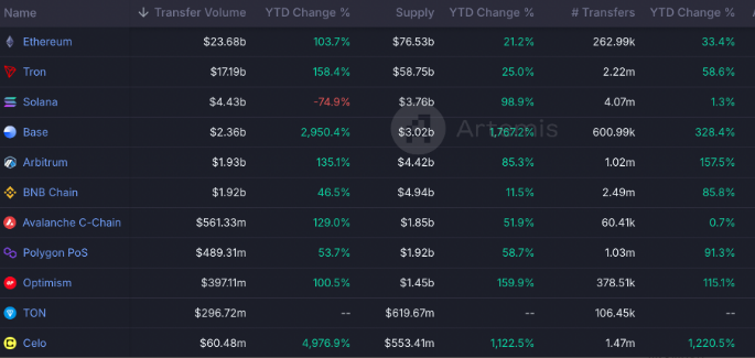 رشد عرضه استیبل کوین در ترون همزمان با افزایش حجم انتقال است که طی 30 روز گذشته 5.1 درصد و از سال تا به امروز 158 درصد رشد داشته و به 58.75 میلیارد دلار رسیده است. سایر زنجیرهها مانند اتریوم و BNB Chain از سال تا به امروز به ترتیب 103% و 46.5% افزایش حجم داشتهاند. حجم انتقال استیبل کوین در سولانا در مدت مشابه 75 درصد کاهش یافته است.