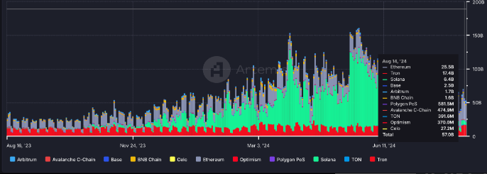 تسلط ترون در کل حجم نقل و انتقالات استیبل کوین روزانه مشهود است که در 15 آگوست به 17.4 میلیارد دلار رسید که از 6.4 میلیارد دلار سولانا و 1.6 میلیارد دلار BNB Chain در همان روز کمتر بود.