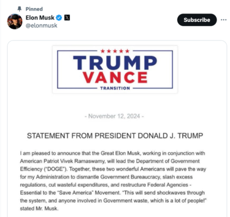 دونالد ترامپ، رئیس جمهور منتخب ایالات متحده، ایلان ماسک و ویوک راماسوامی را به عنوان رهبری یک آژانس دولتی جدید، وزارت کارآیی دولت (DOGE)، با هدف کاهش هزینه های فدرال و کاهش مقررات منصوب کرد.