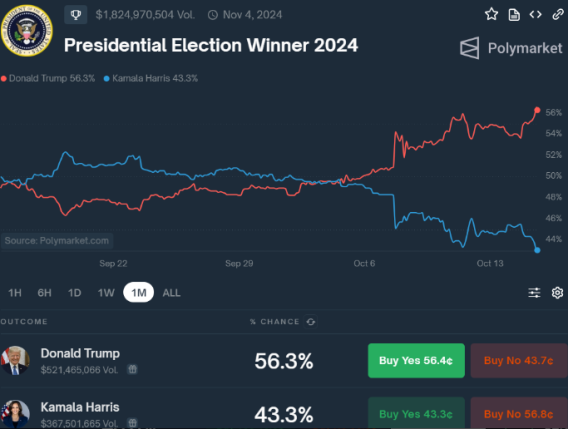 بر اساس پیشبینی بازار پلی مارکت، شانس ترامپ برای پیروزی در انتخابات ریاستجمهوری آمریکا در 15 اکتبر 13 امتیاز از شرطبندیها برای پیروزی هریس بیشتر شد.