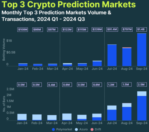 پلی مارکت، برجسته ترین پلتفرم غیرمتمرکز، با بیش از 99 درصد سهم بازار تا سپتامبر، بر بازار تسلط داشت. بیش از 46 درصد از حجم پولی مارکت از سال تا به امروز توسط نظرسنجی انتخابات ریاست جمهوری ایالات متحده انجام شده است.