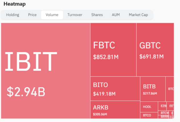 بر اساس دادههای کوین گلس، ETFهای بیتکوین نقطهای، حجم کل روزانه ۵.۲۴ میلیارد دلار را در روز به ثبت رساندند که بیش از نیمی از آن متعلق به تراست بیت کوین آی شرز بود.